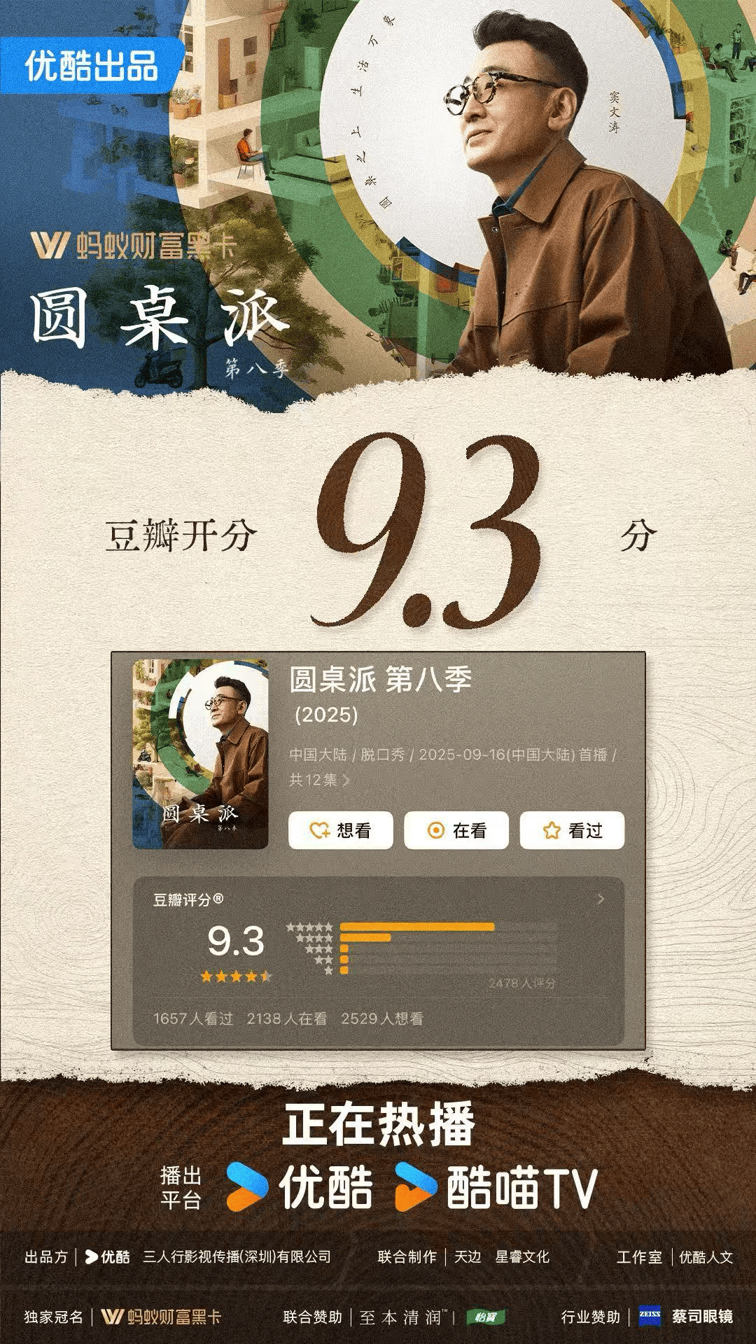 “聊天节目天花板”《圆桌派》长期占据优酷人文热度榜、热搜榜TOP1。第八季豆瓣开分9.3,实现八季均分保持在9分以上的纪录,内容品质的稳定性让品牌愿意持续投入。