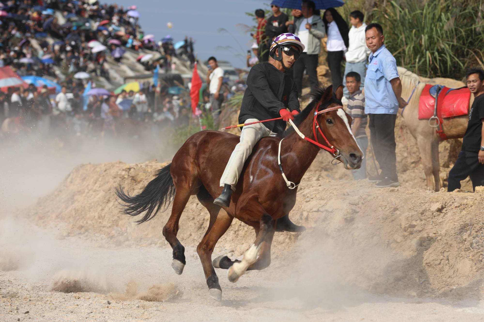 端节期间,在三都水族自治县周覃镇高峰村的端坡上人声鼎沸,蜿蜒的山道两侧,挤满了翘首以盼的群众和远道而来的游客。随着一声哨响,骑手们策马跃出起跑线,马蹄翻腾,尘土飞扬,奋勇争先,高超的骑术让人惊叹。